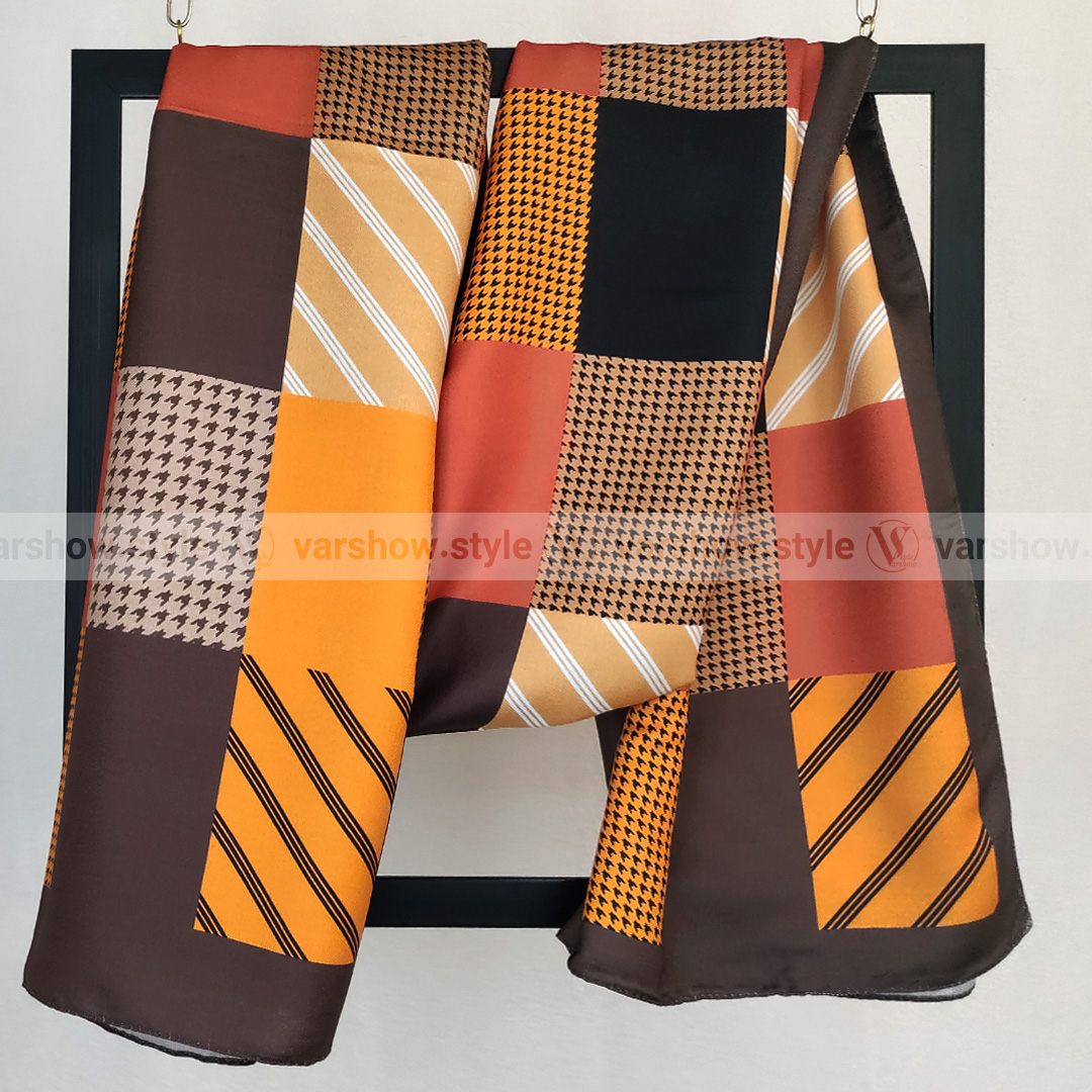 شال نخی پاییز قواره دار تک رنگ تناژ نارنجی با حاشیه قهوه ای جز محصولاتی است که به طبع رنگ های گرم به کار رفته همیشه مناسب فصل های سرد بوده و از مد نخواهد افتاد.